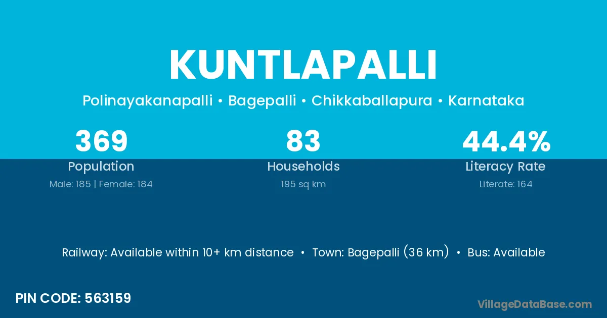 Bagepalli (36 km) is the nearest town to Kuntlapalli village for major economic activities and is located approximately 36 km away.