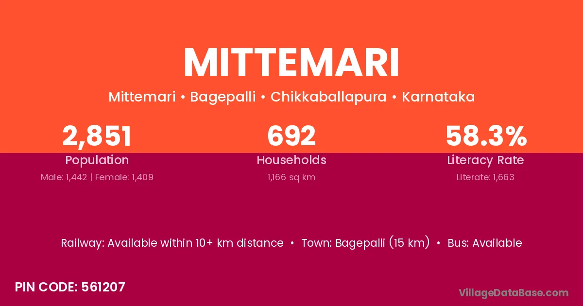 Bagepalli (15 km) is the nearest town to Mittemari village for major economic activities and is located approximately 15 km away.