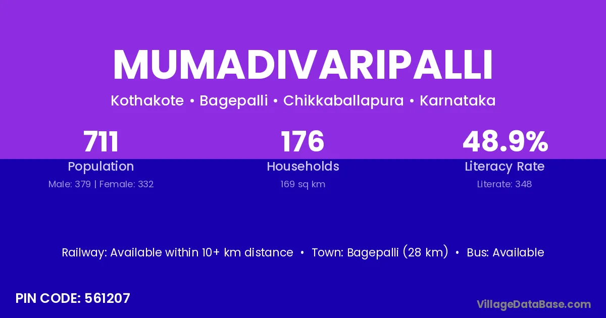 Bagepalli (28 km) is the nearest town to Mumadivaripalli village for major economic activities and is located approximately 28 km away.