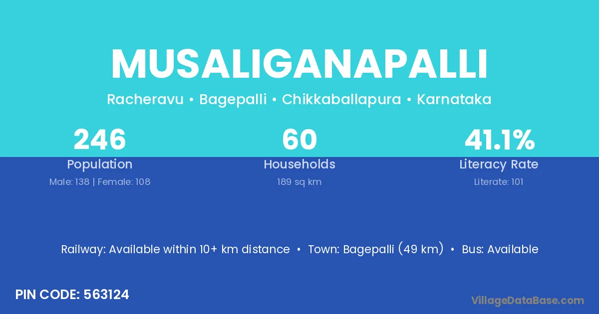 Bagepalli (49 km) is the nearest town to Musaliganapalli village for major economic activities and is located approximately 49 km away.