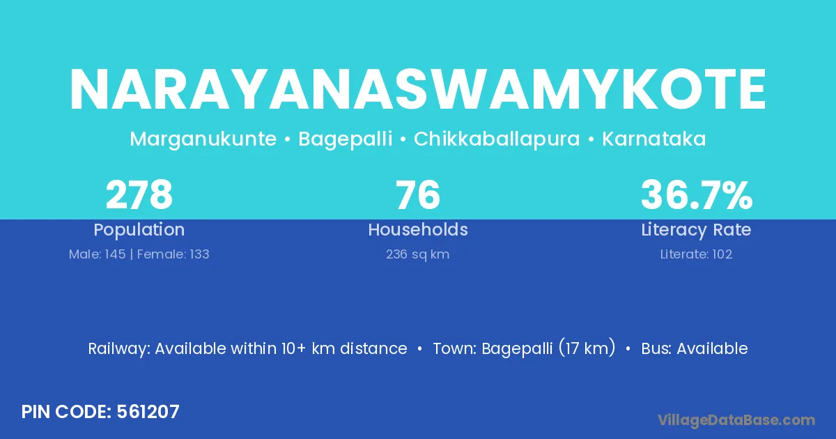 Bagepalli (17 km) is the nearest town to Narayanaswamykote village for major economic activities and is located approximately 17 km away.