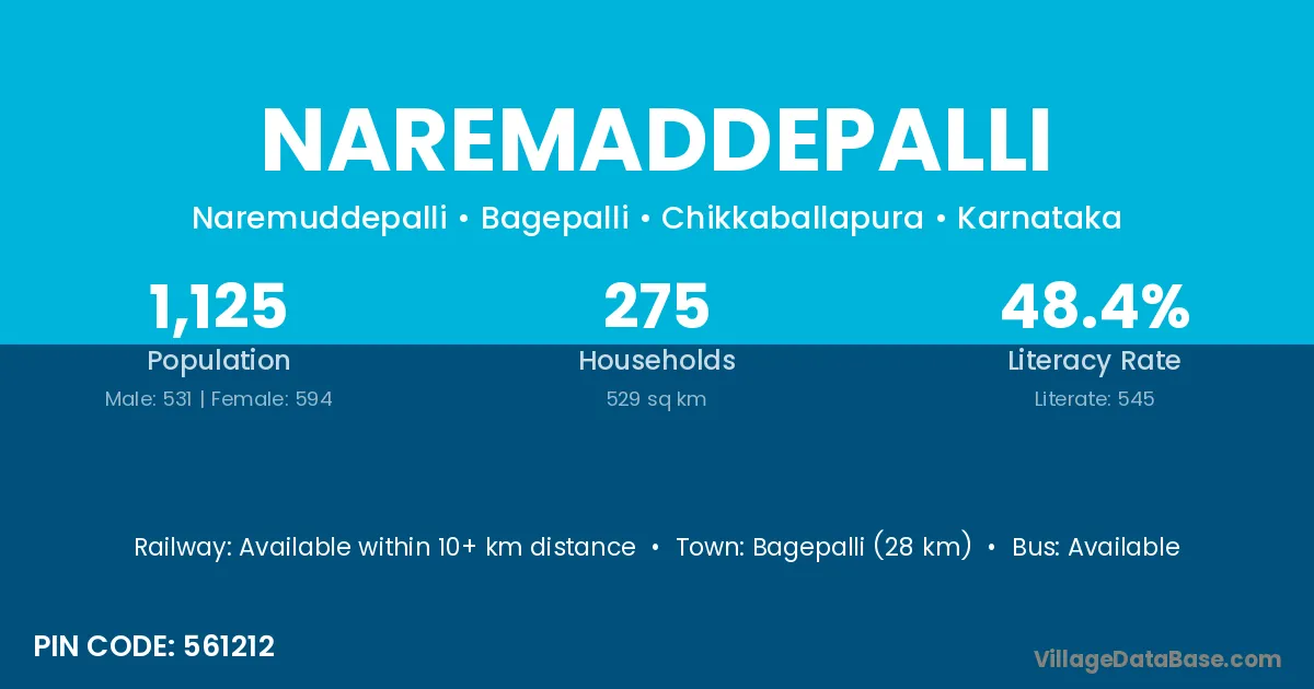 Bagepalli (28 km) is the nearest town to Naremaddepalli village for major economic activities and is located approximately 28 km away.