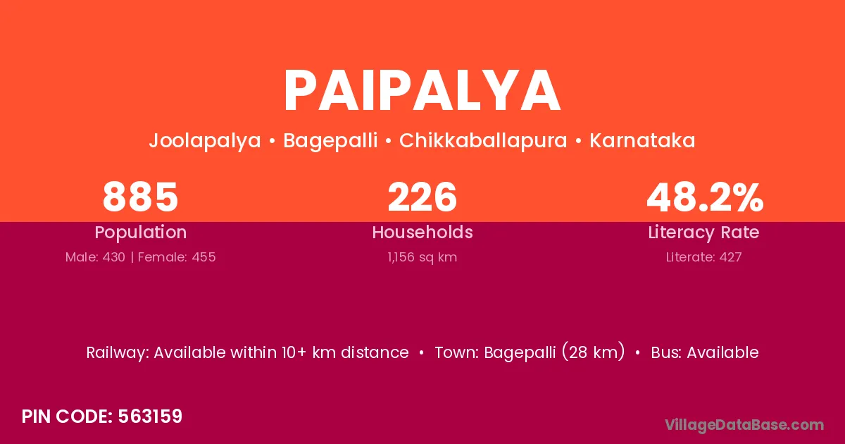 Bagepalli (28 km) is the nearest town to Paipalya village for major economic activities and is located approximately 28 km away.