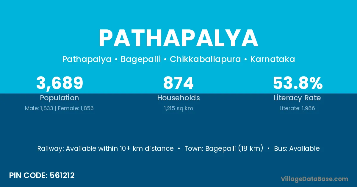 Bagepalli (18 km) is the nearest town to Pathapalya village for major economic activities and is located approximately 18 km away.