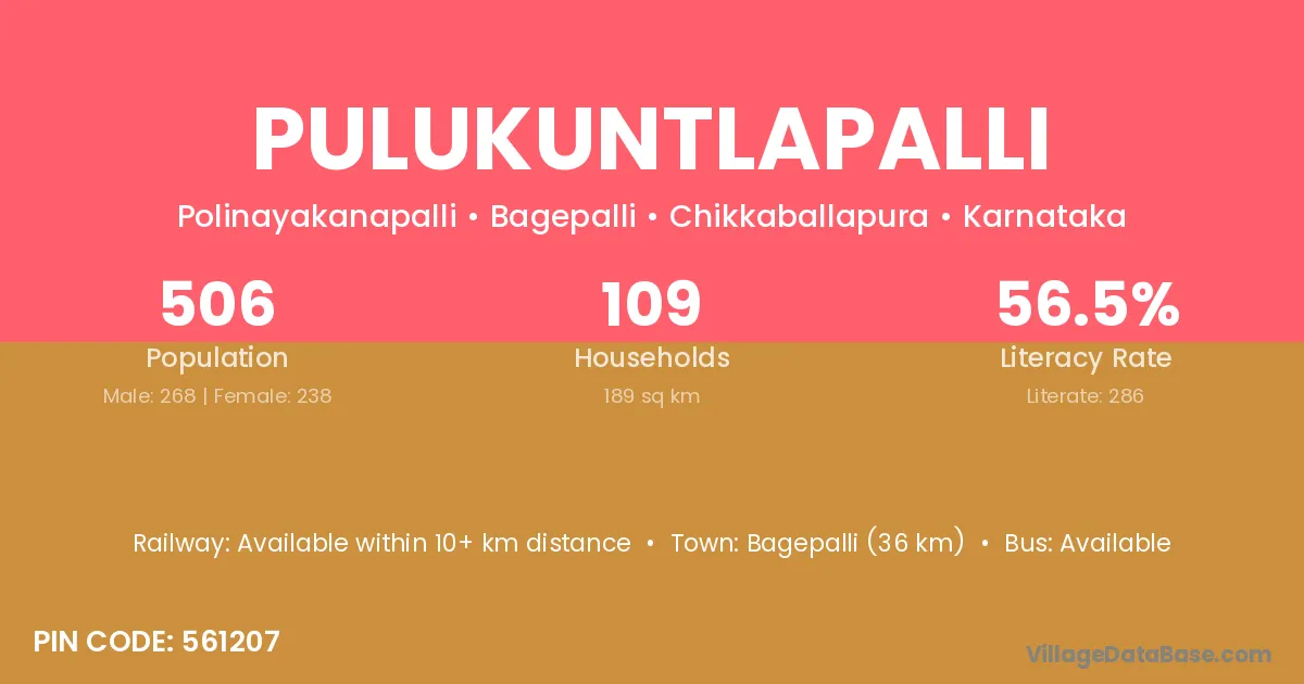 Bagepalli (36 km) is the nearest town to Pulukuntlapalli village for major economic activities and is located approximately 36 km away.