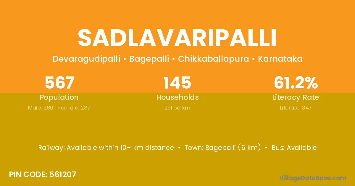 Bagepalli (6 km) is the nearest town to Sadlavaripalli village for major economic activities and is located approximately 6 km away.