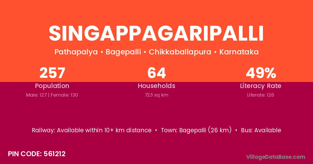 Bagepalli (26 km) is the nearest town to Singappagaripalli village for major economic activities and is located approximately 26 km away.