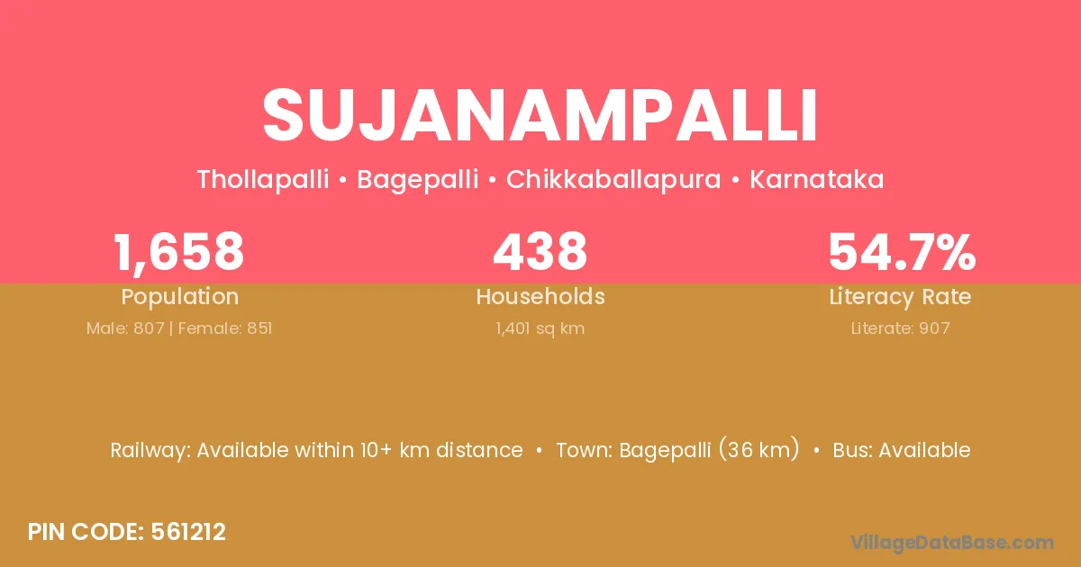 Bagepalli (36 km) is the nearest town to Sujanampalli village for major economic activities and is located approximately 36 km away.
