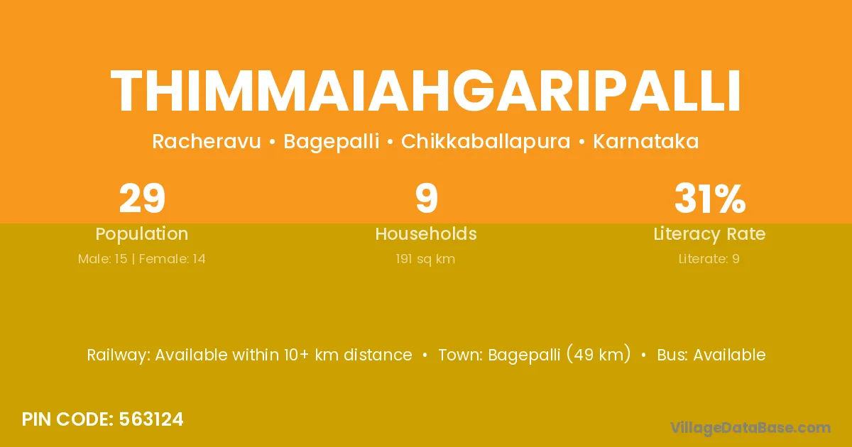 Bagepalli (49 km) is the nearest town to Thimmaiahgaripalli village for major economic activities and is located approximately 49 km away.