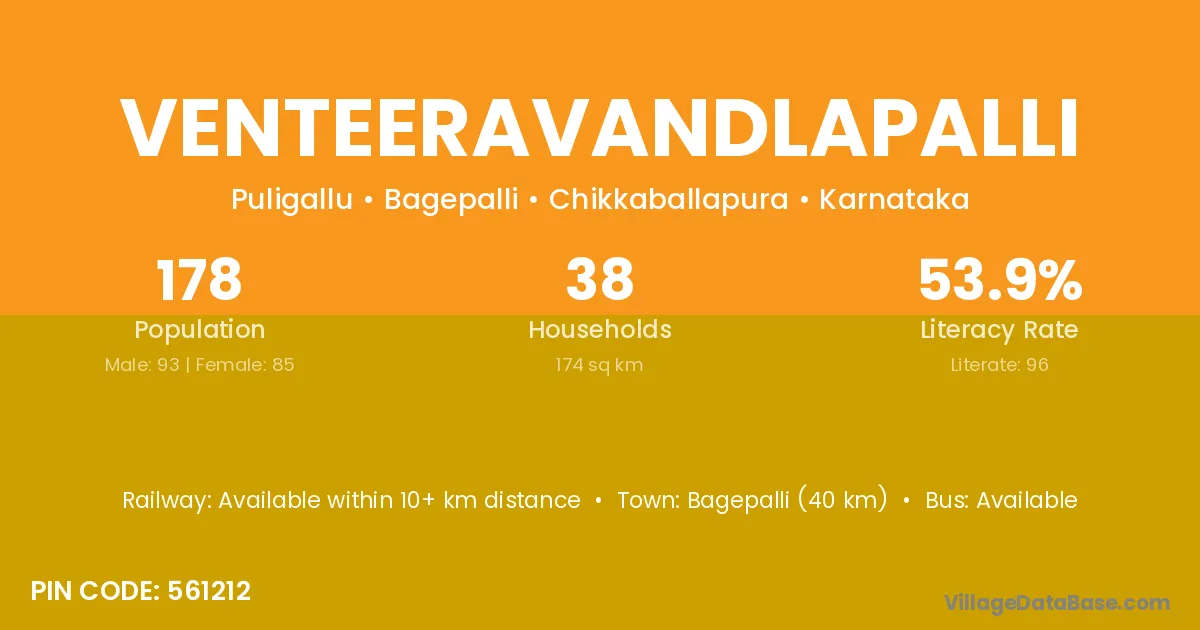 Bagepalli (40 km) is the nearest town to Venteeravandlapalli village for major economic activities and is located approximately 40 km away.