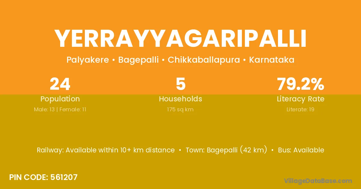 Bagepalli (42 km) is the nearest town to Yerrayyagaripalli village for major economic activities and is located approximately 42 km away.