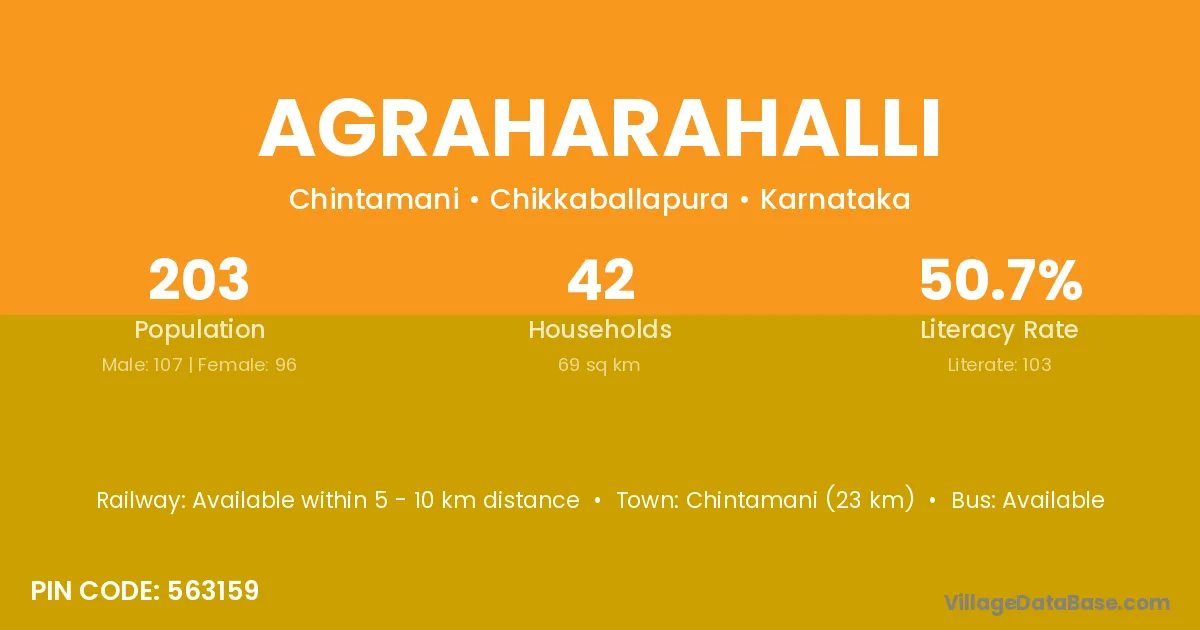 Chintamani (23 km) is the nearest town to Agraharahalli village for major economic activities and is located approximately 23 km away.