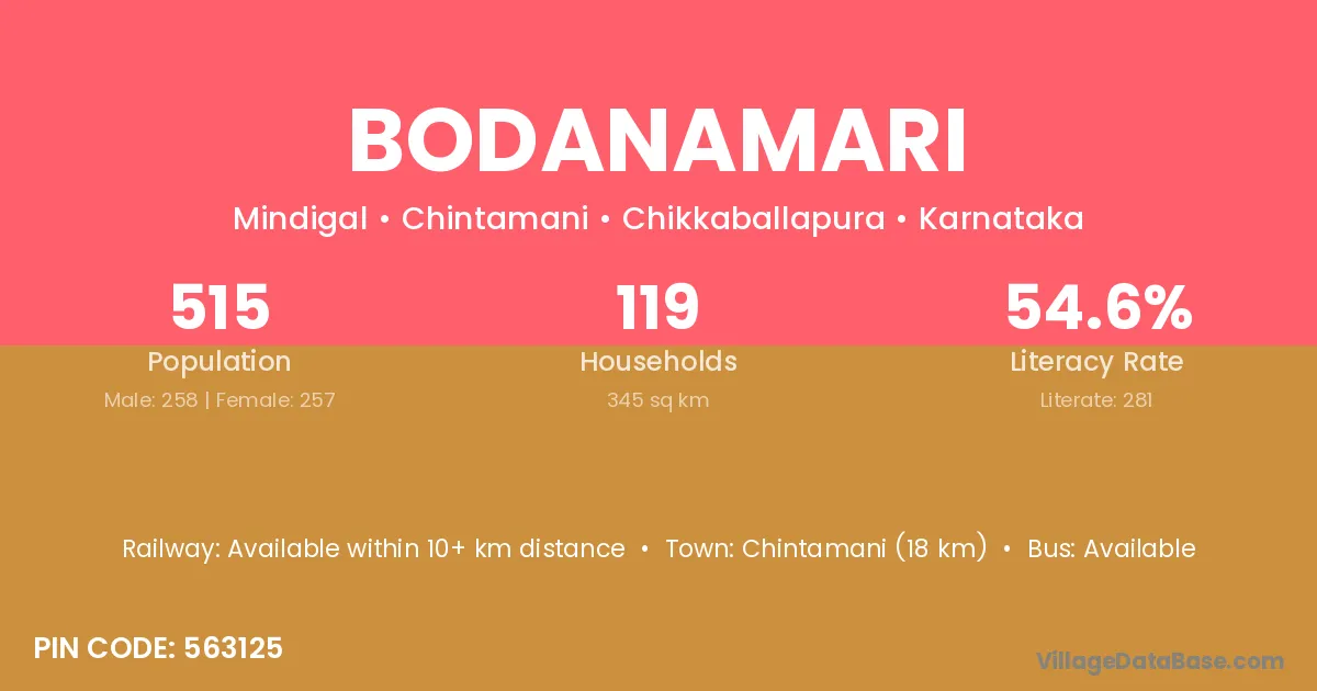 Chintamani (18 km) is the nearest town to Bodanamari village for major economic activities and is located approximately 18 km away.