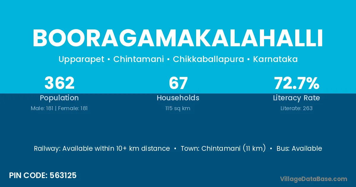 Chintamani (11 km) is the nearest town to Booragamakalahalli village for major economic activities and is located approximately 11 km away.