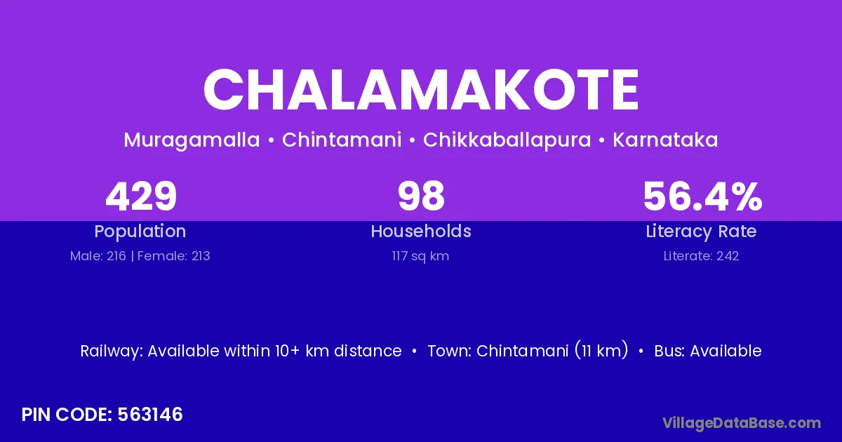 Chintamani (11 km) is the nearest town to Chalamakote village for major economic activities and is located approximately 11 km away.