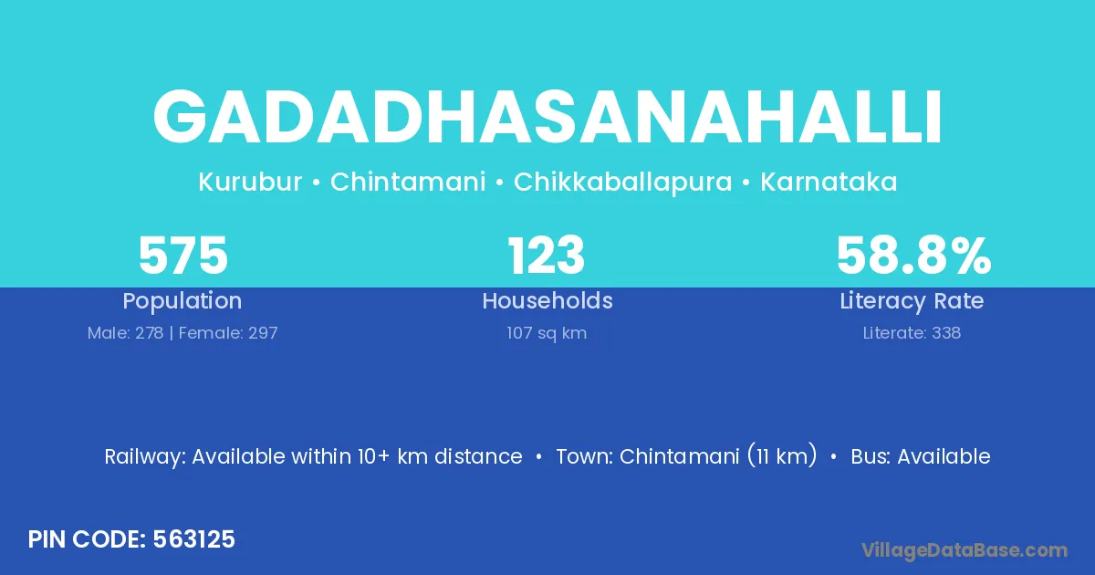 Chintamani (11 km) is the nearest town to Gadadhasanahalli village for major economic activities and is located approximately 11 km away.