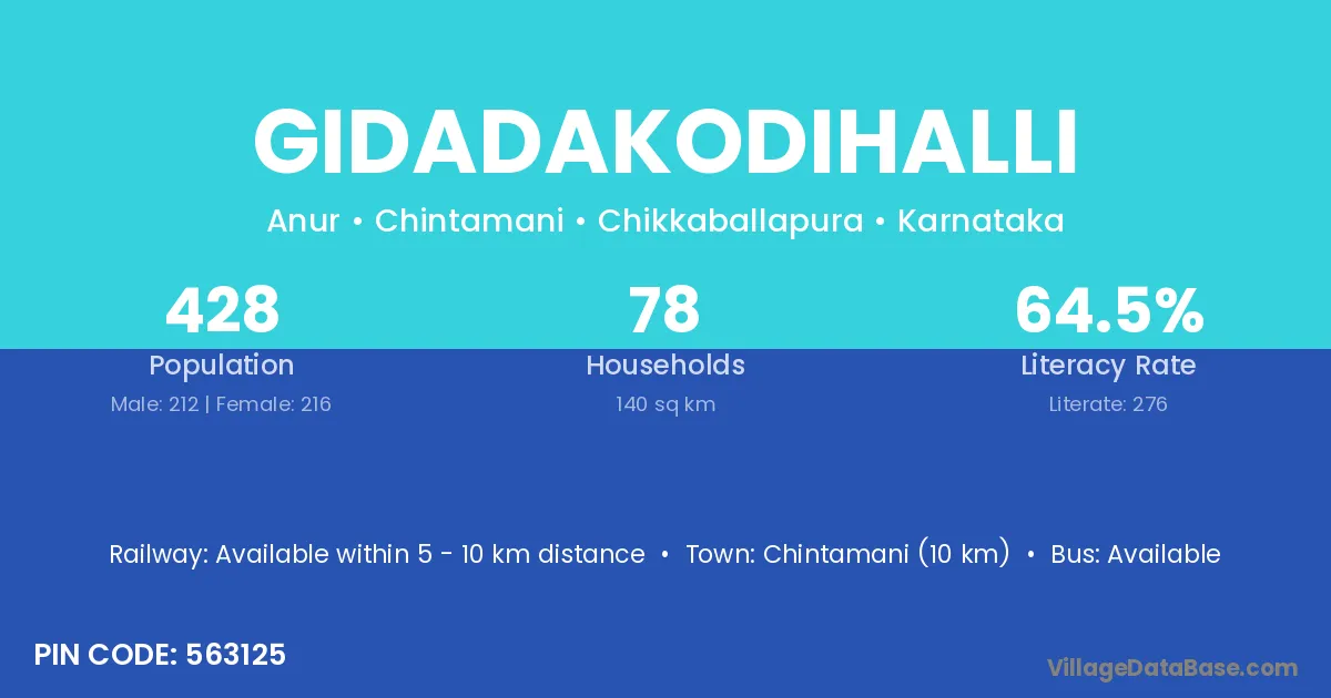 Gidadakodihalli village has a total population of 428 people, of which 212 are males and 216 are females.