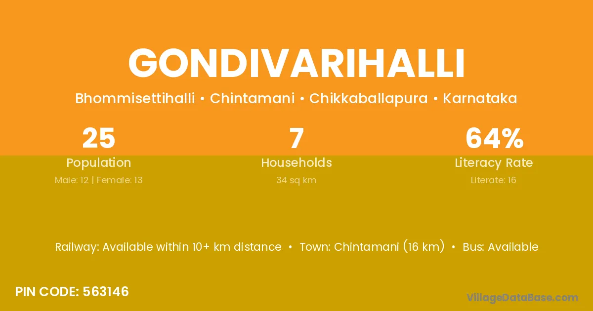 Chintamani (16 km) is the nearest town to Gondivarihalli village for major economic activities and is located approximately 16 km away.