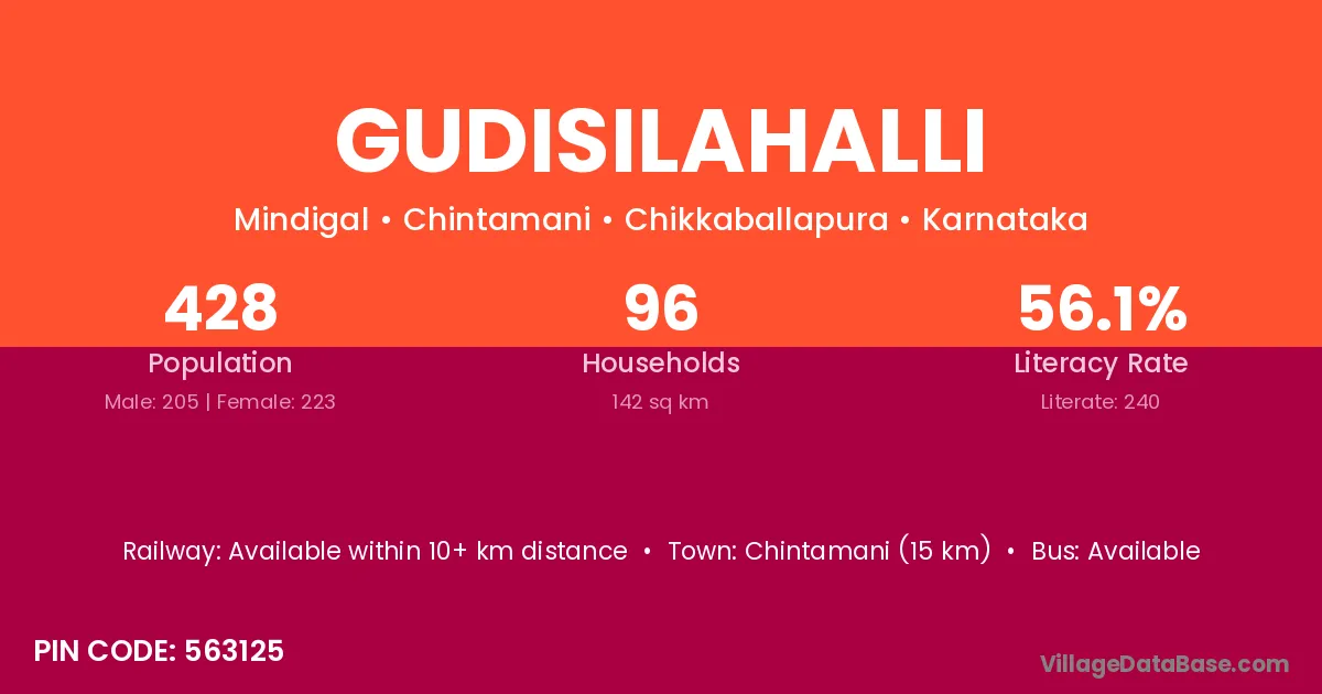 Gudisilahalli village has a total population of 428 people, of which 205 are males and 223 are females.