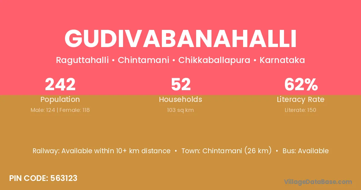 Gudivabanahalli village has a total population of 242 people, of which 124 are males and 118 are females.
