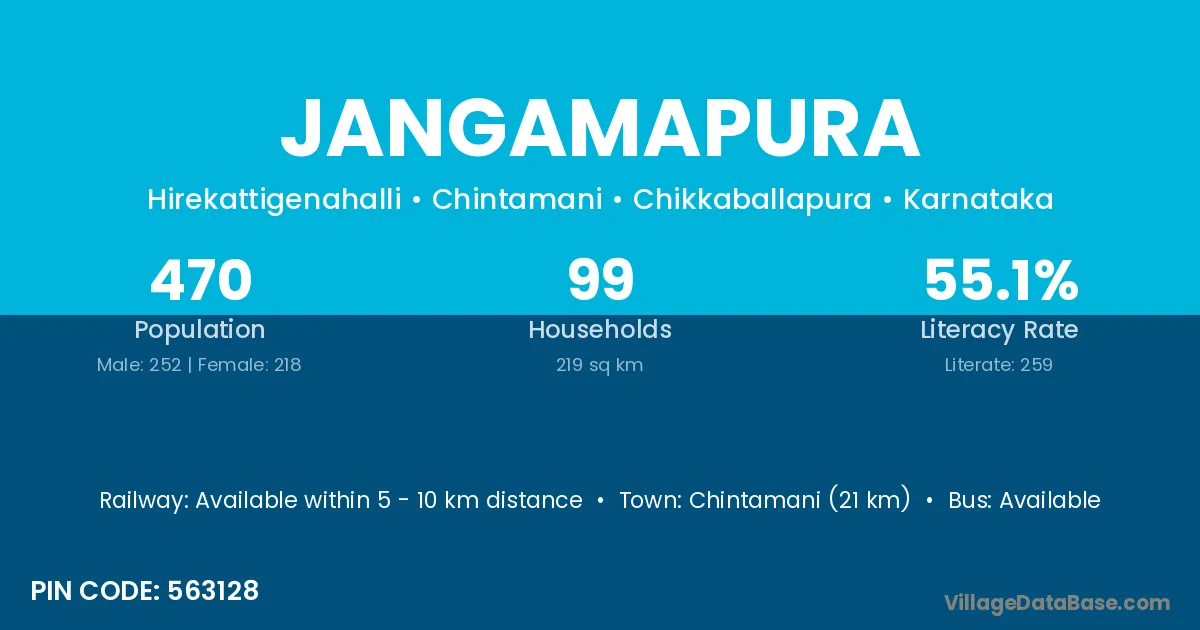 Chintamani (21 km) is the nearest town to Jangamapura village for major economic activities and is located approximately 21 km away.