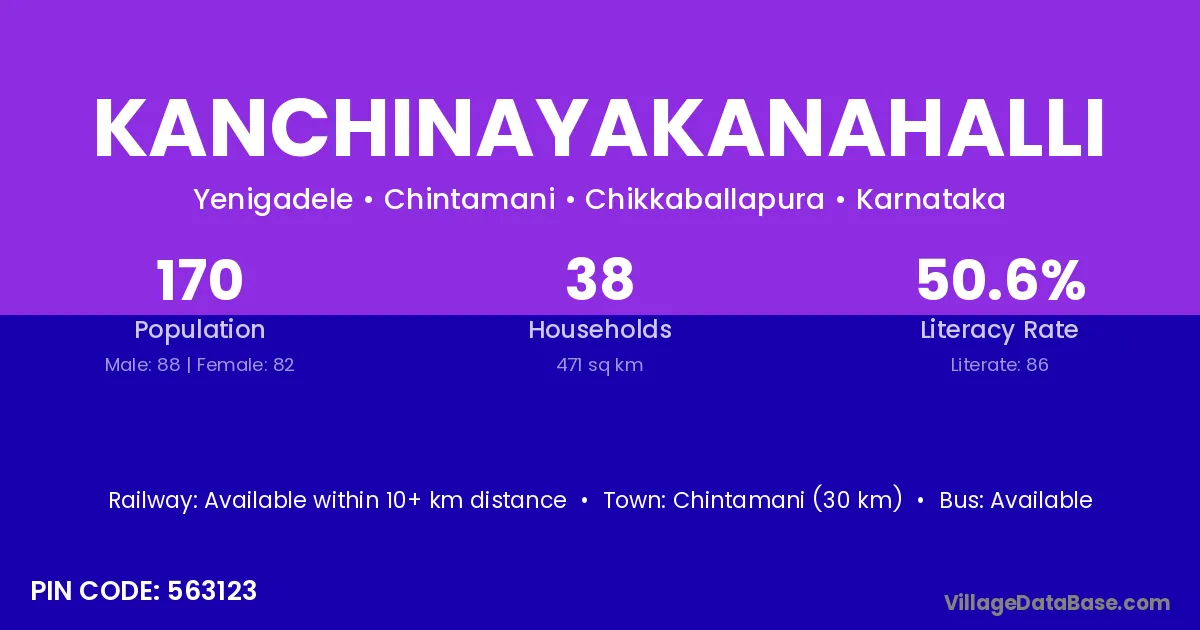 Chintamani (30 km) is the nearest town to Kanchinayakanahalli village for major economic activities and is located approximately 30 km away.