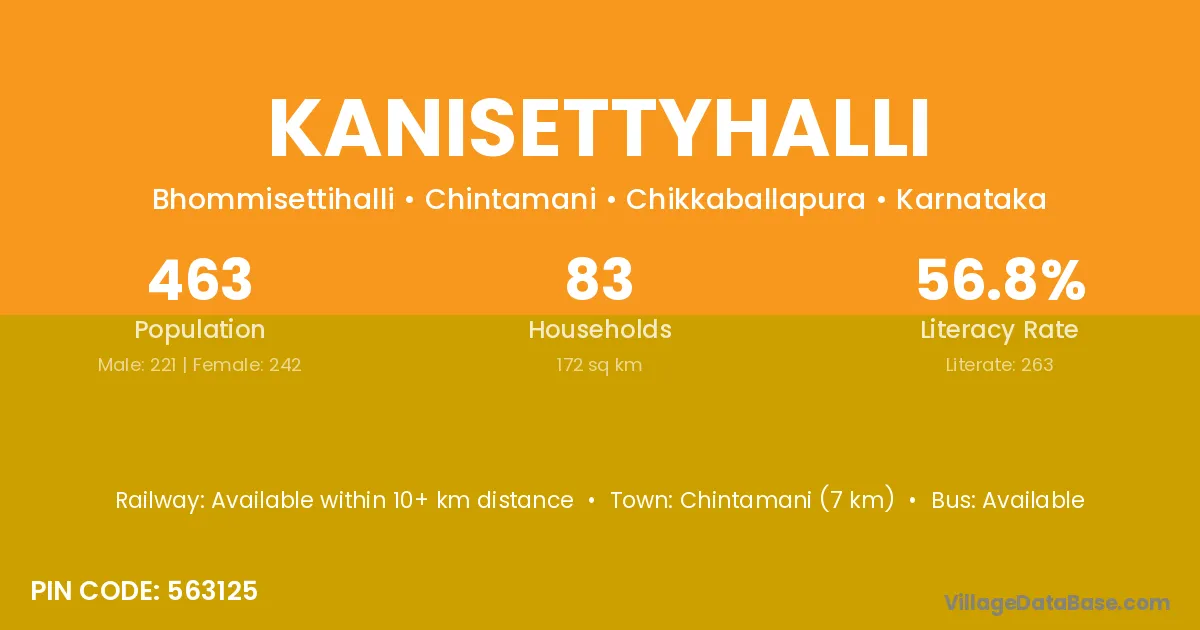 Chintamani (7 km) is the nearest town to Kanisettyhalli village for major economic activities and is located approximately 7 km away.