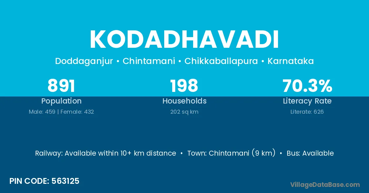Chintamani (9 km) is the nearest town to Kodadhavadi village for major economic activities and is located approximately 9 km away.