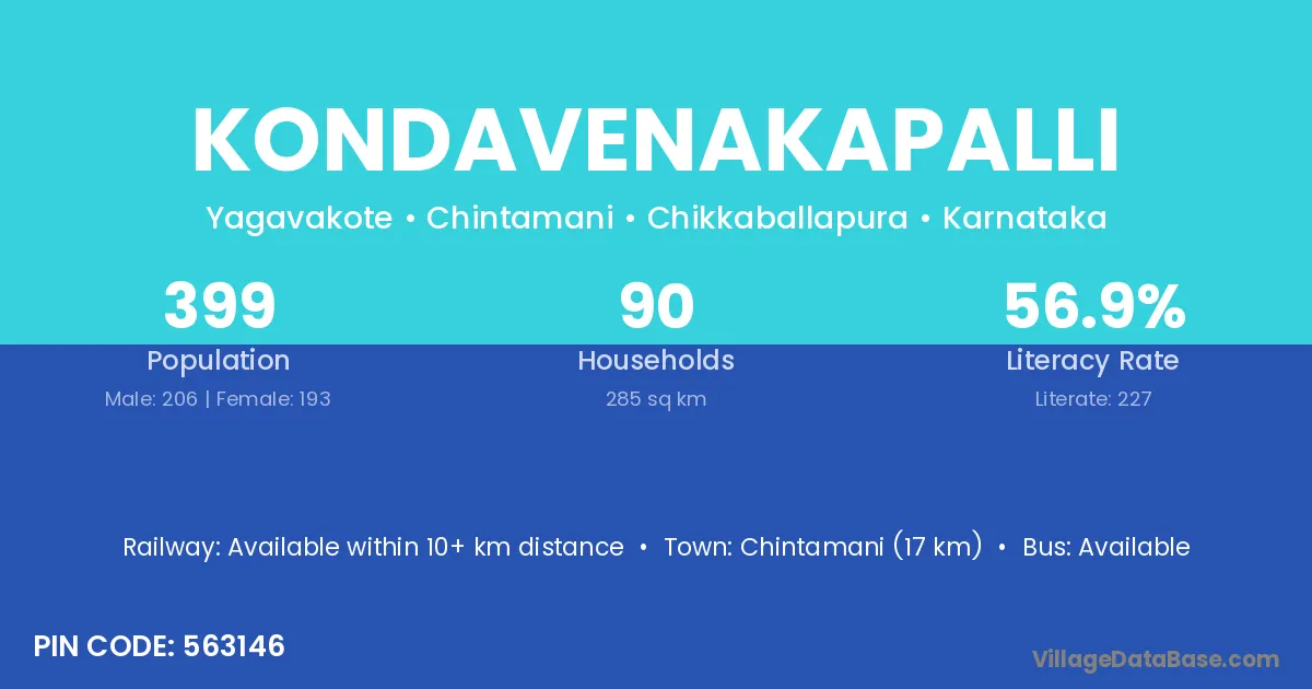 Chintamani (17 km) is the nearest town to Kondavenakapalli village for major economic activities and is located approximately 17 km away.