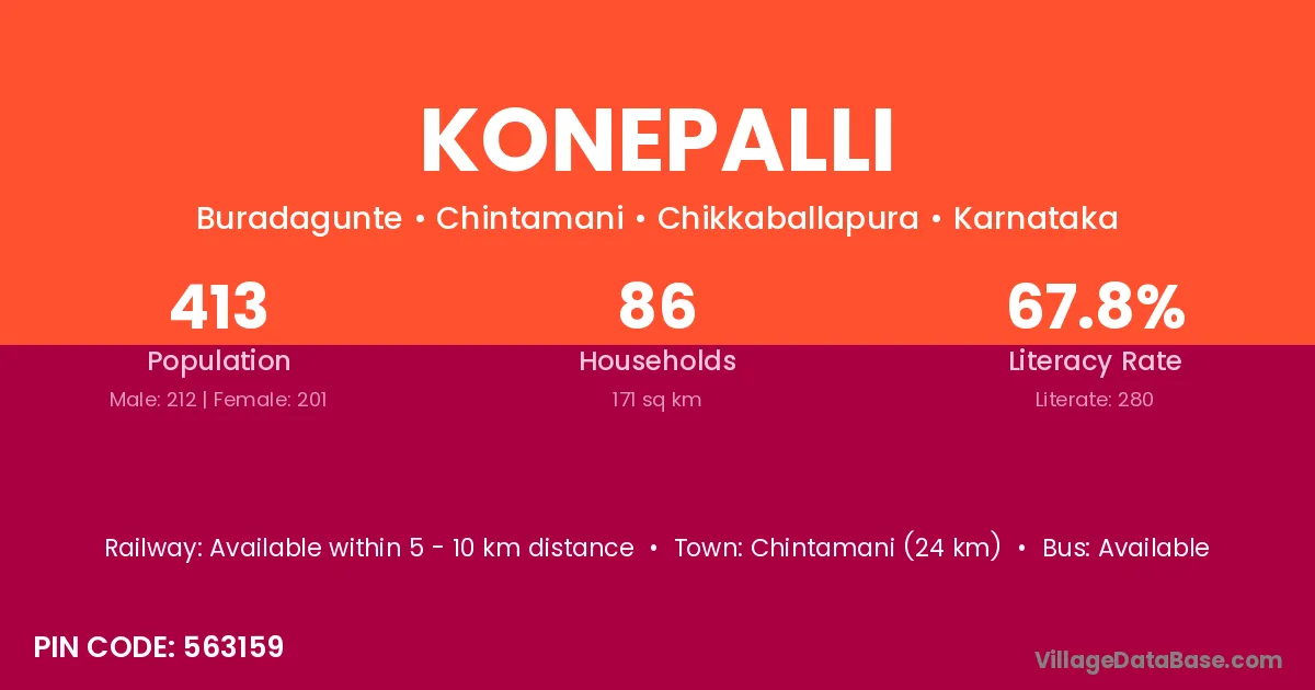 Chintamani (24 km) is the nearest town to Konepalli village for major economic activities and is located approximately 24 km away.