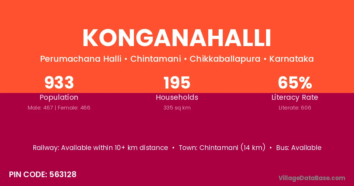 Chintamani (14 km) is the nearest town to Konganahalli village for major economic activities and is located approximately 14 km away.