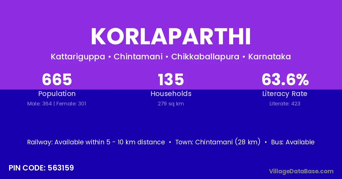 Chintamani (28 km) is the nearest town to Korlaparthi village for major economic activities and is located approximately 28 km away.
