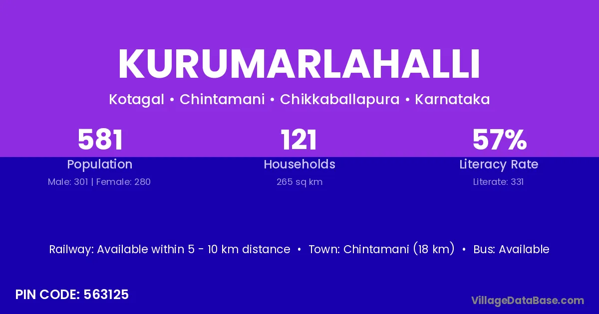 Chintamani (18 km) is the nearest town to Kurumarlahalli village for major economic activities and is located approximately 18 km away.