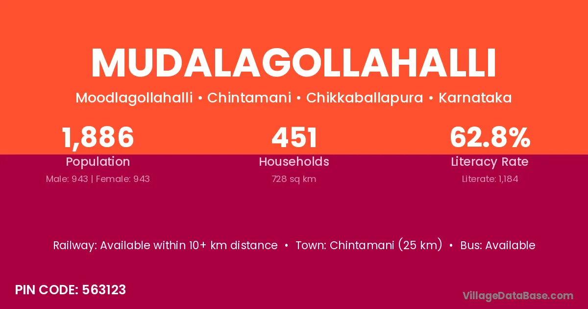 Chintamani (25 km) is the nearest town to Mudalagollahalli village for major economic activities and is located approximately 25 km away.