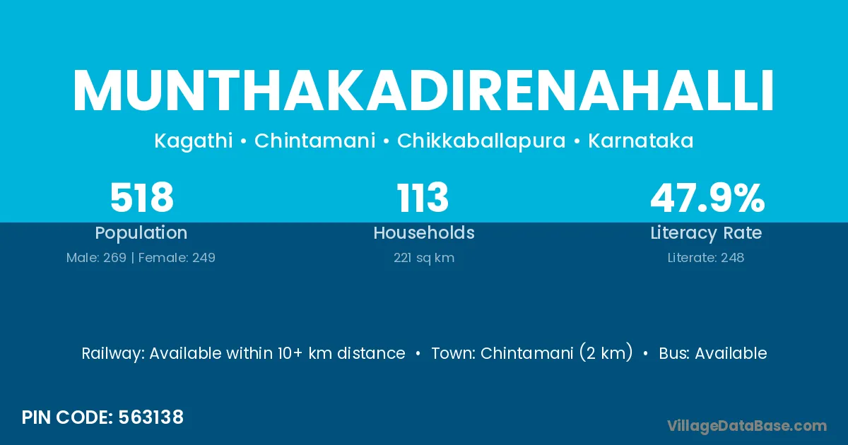 Chintamani (2 km) is the nearest town to Munthakadirenahalli village for major economic activities and is located approximately 2 km away.
