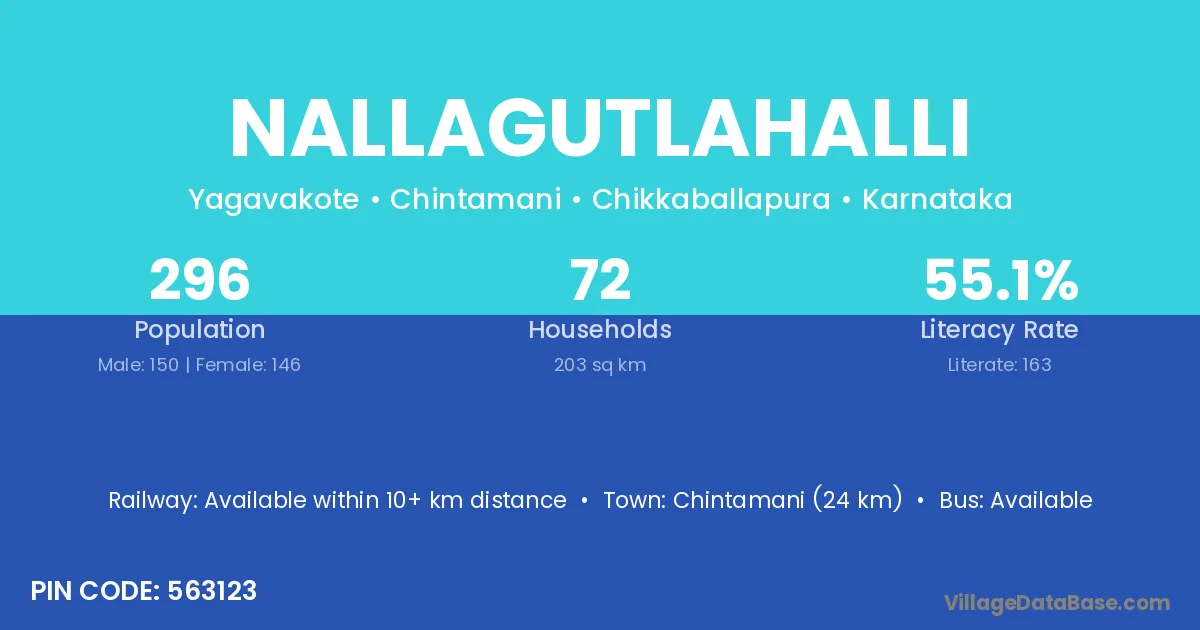Chintamani (24 km) is the nearest town to Nallagutlahalli village for major economic activities and is located approximately 24 km away.
