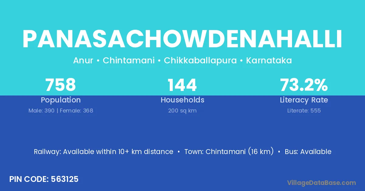 Chintamani (16 km) is the nearest town to Panasachowdenahalli village for major economic activities and is located approximately 16 km away.
