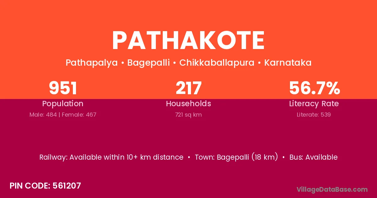 Chintamani (21 km) is the nearest town to Pathakote village for major economic activities and is located approximately 21 km away.