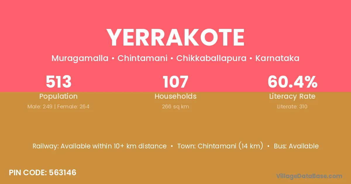 Chintamani (14 km) is the nearest town to Yerrakote village for major economic activities and is located approximately 14 km away.