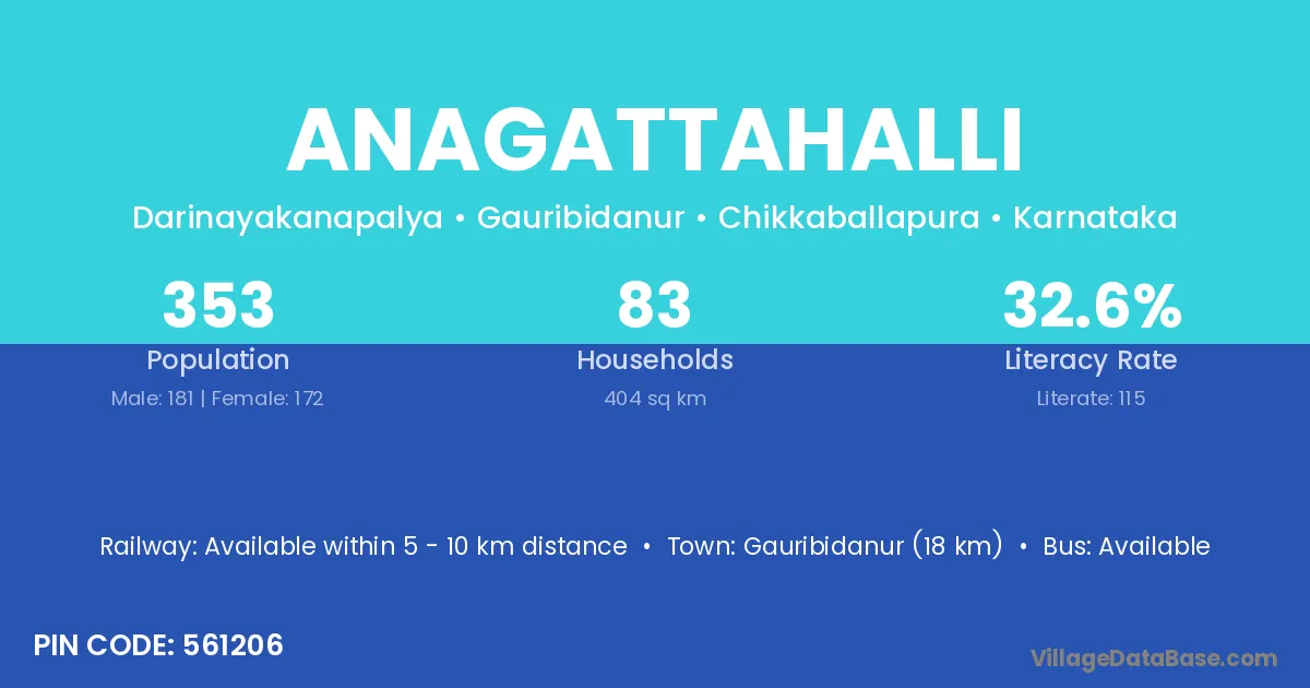 Gauribidanur (18 km) is the nearest town to Anagattahalli village for major economic activities and is located approximately 18 km away.