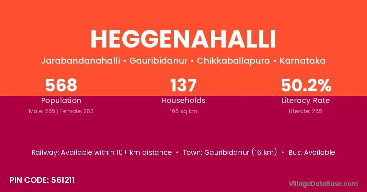 Heggenahalli village has a total population of 568 people, of which 285 are males and 283 are females.