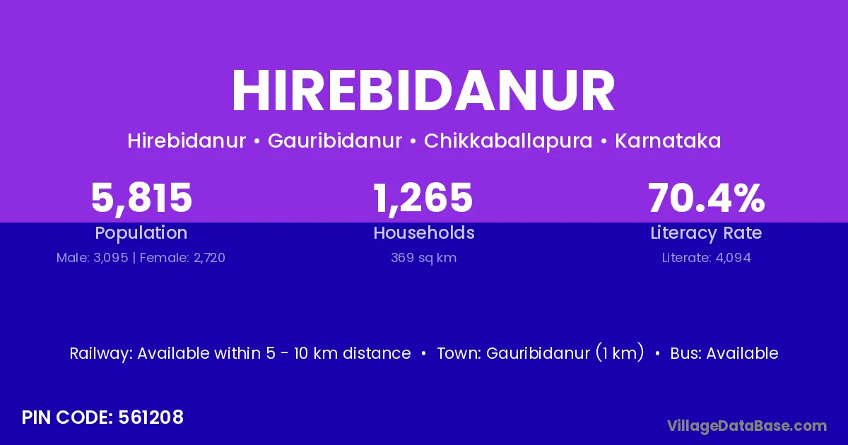 Gauribidanur (1 km) is the nearest town to Hirebidanur village for major economic activities and is located approximately 1 km away.