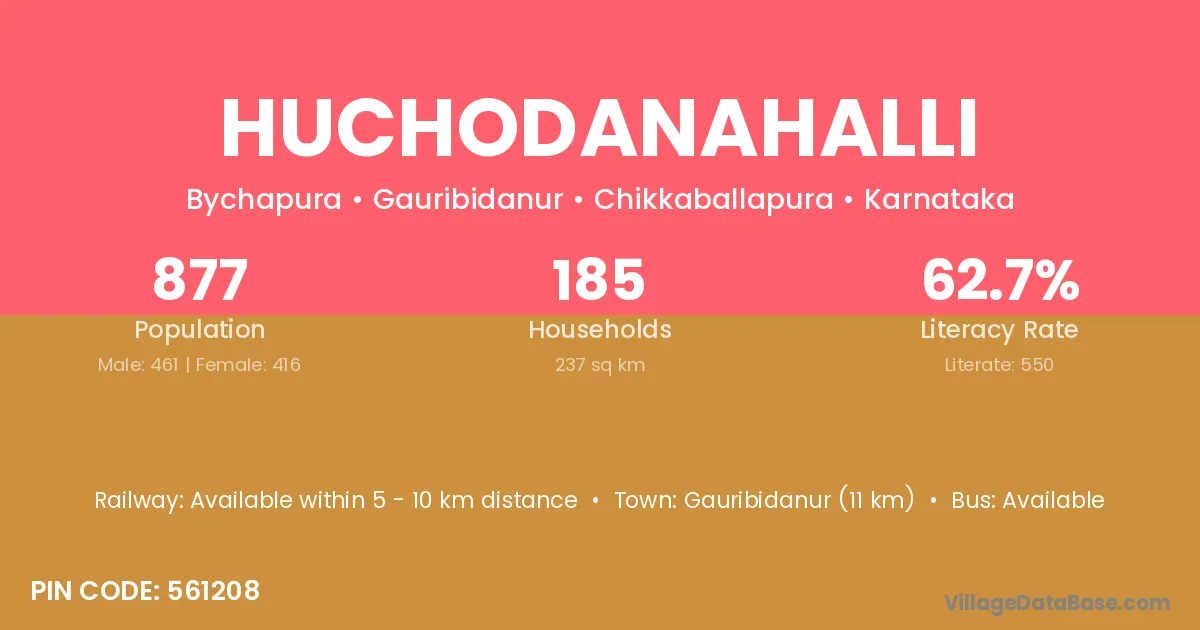 Gauribidanur (11 km) is the nearest town to Huchodanahalli village for major economic activities and is located approximately 11 km away.