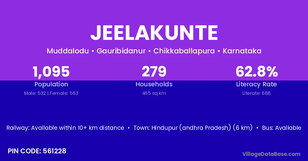 Jeelakunte village has a total population of 1,095 people, of which 532 are males and 563 are females.