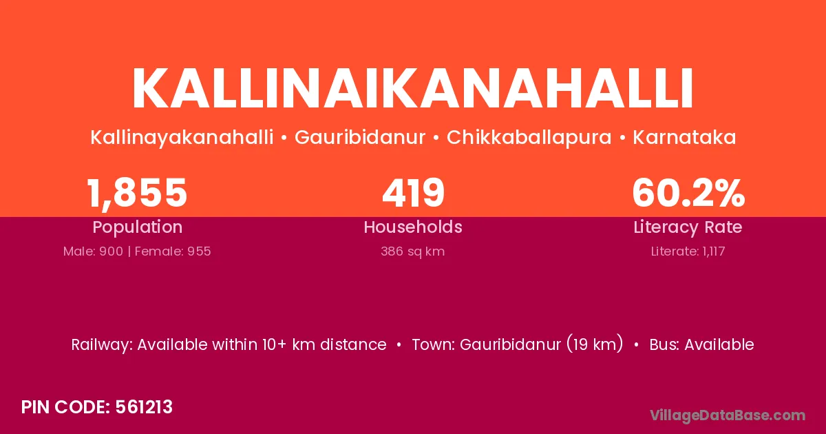 Gauribidanur (19 km) is the nearest town to Kallinaikanahalli village for major economic activities and is located approximately 19 km away.