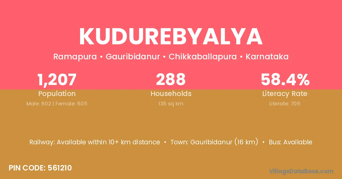 Kudurebyalya village has a total population of 1,207 people, of which 602 are males and 605 are females.