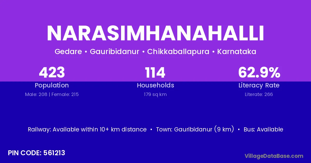 Gauribidanur (9 km) is the nearest town to Narasimhanahalli village for major economic activities and is located approximately 9 km away.