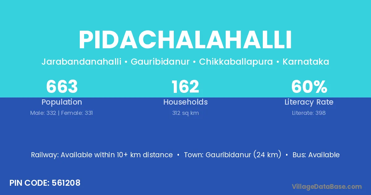 Gauribidanur (24 km) is the nearest town to Pidachalahalli village for major economic activities and is located approximately 24 km away.