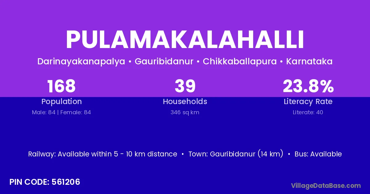 Pulamakalahalli village has a total population of 168 people, of which 84 are males and 84 are females.