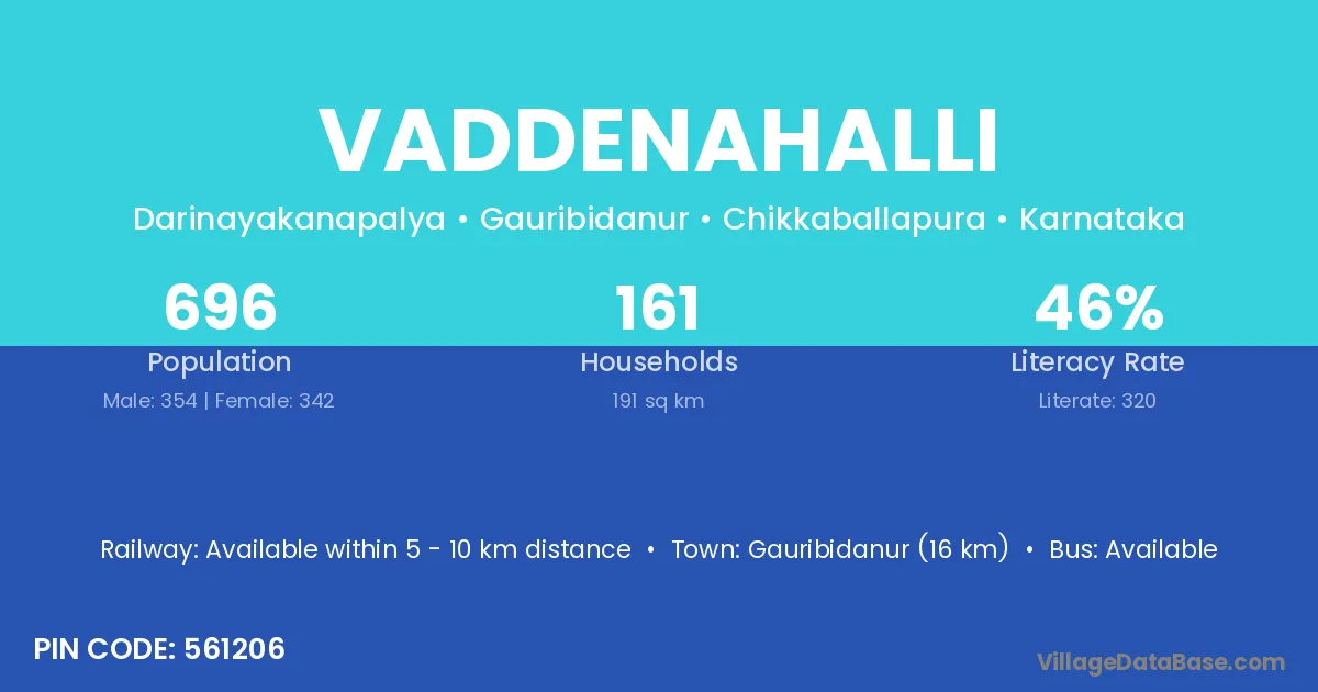 Gauribidanur (16 km) is the nearest town to Vaddenahalli village for major economic activities and is located approximately 16 km away.